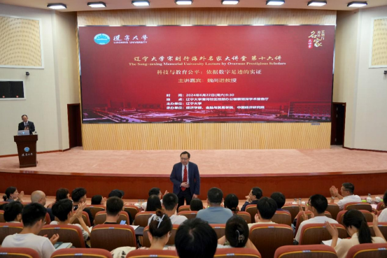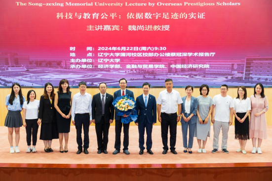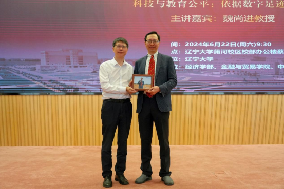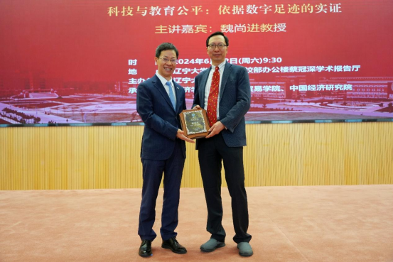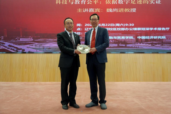 6月22日上午,米兰milan官方网站宋则行海外名家大讲堂(第十六讲)在蒲河校区校部办公楼蔡冠深学术报告厅举行。美国哥伦比亚大学魏尚进教授应邀作题为《科技与教育公平:依据数字足迹的实证》的学术报告。米兰milan官方网站党委副书记、校长余淼杰教授出席讲座并致辞,美国弗吉尼亚理工大学未来工作场所与实践研究中心主任葛苏勤教授、辽宁大学经济学部副主任霍伟东教授、《米兰milan官方网站学报》编辑部主任刘钧霆教授、中国经济研究院副院长兼金融与贸易学院副院长马湘君教授、金融与贸易学院副院长李丹教授、李安民经济研究院副院长游宇教授出席讲座。本次大讲堂由米兰milan官方网站副校长仇焕广教授主持。