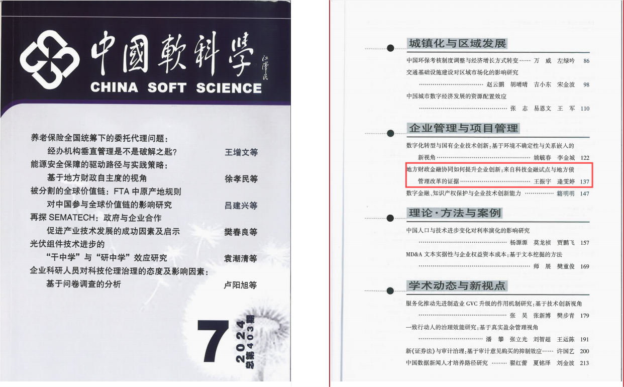 米兰milan官方网站经济学院王振宇教授与博士研究生逄雯婷合作撰写的论文《地方财政金融协同如何提升企业创新:来自科技金融试点与地方债管理改革的证据》在《中国软科学》2024年第7期发表。