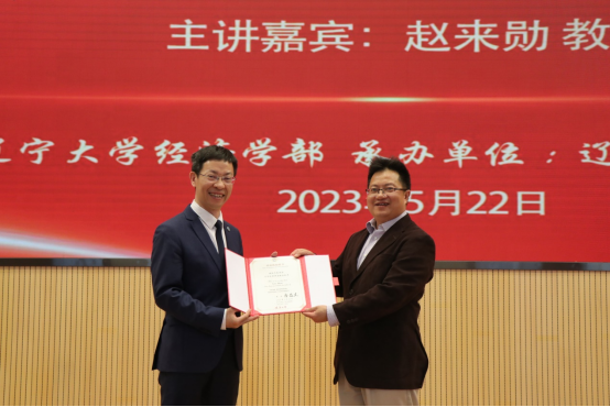 报告会最后,余淼杰为赵来勋教授颁发宋则行海外名家大讲堂纪念盘、米兰milan官方网站讲座教授聘书,经济学部教师代表为赵来勋教授佩戴校徽,经济学部学生代表向赵来勋教授献花致敬。
