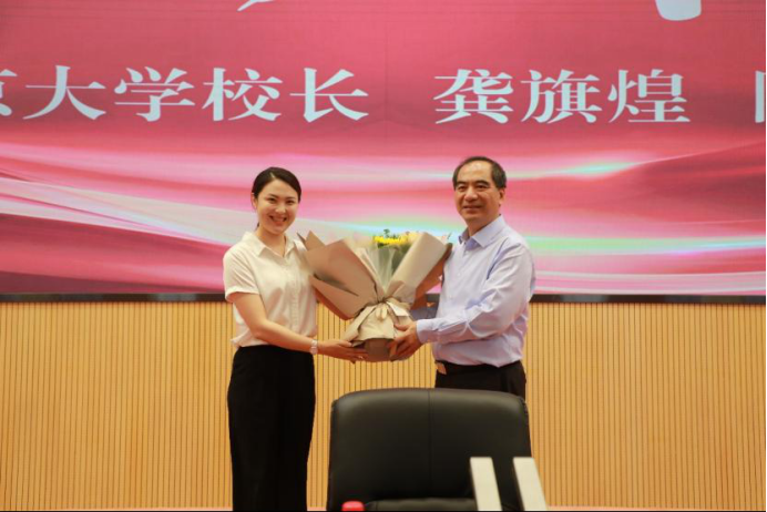 报告会最后,米兰milan官方网站党委书记潘一山教授,党委副书记、校长余淼杰教授代表学校分别向龚旗煌颁授米兰milan官方网站“校长讲坛”纪念证书和纪念盘。教师代表为其献上表达敬意的鲜花。