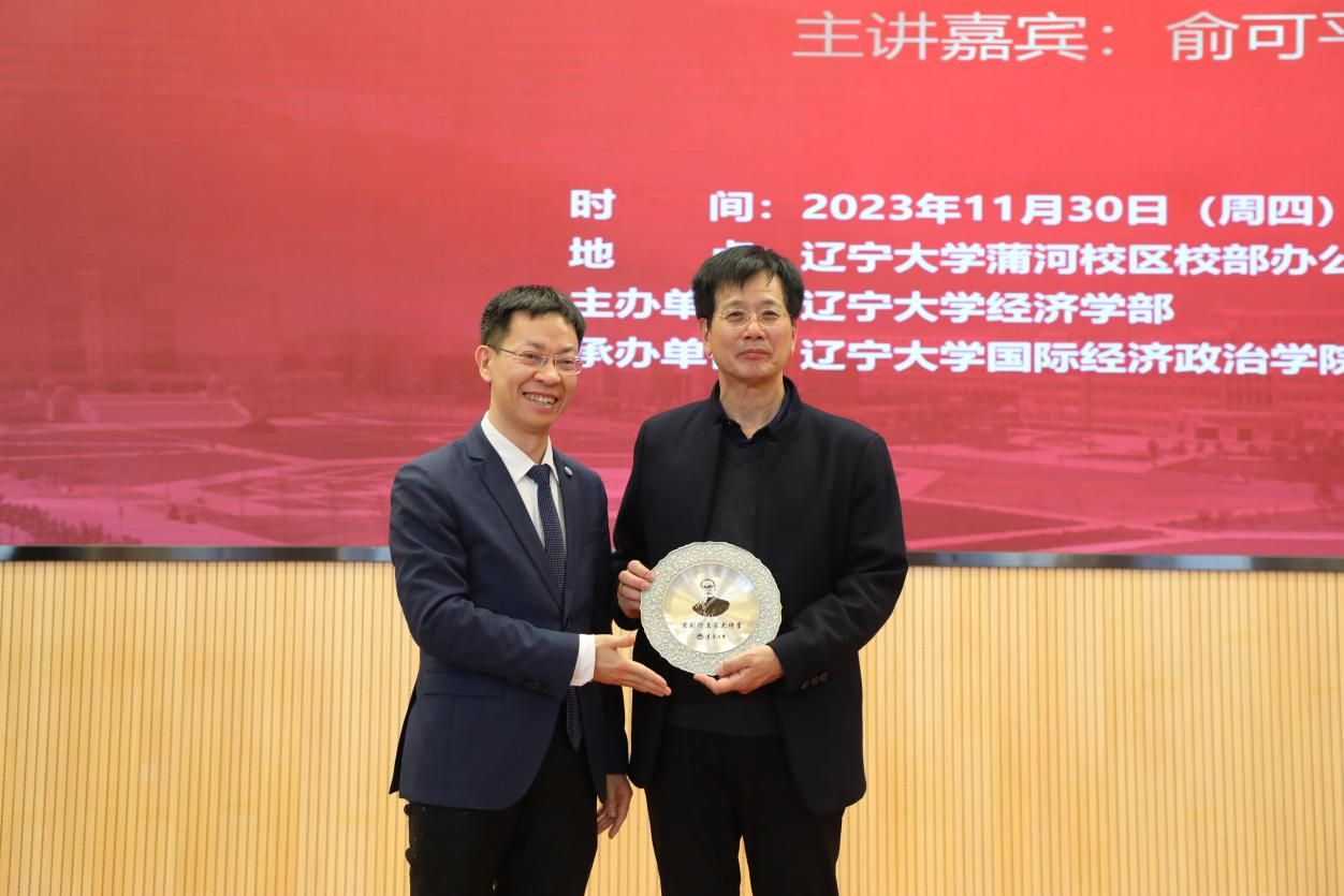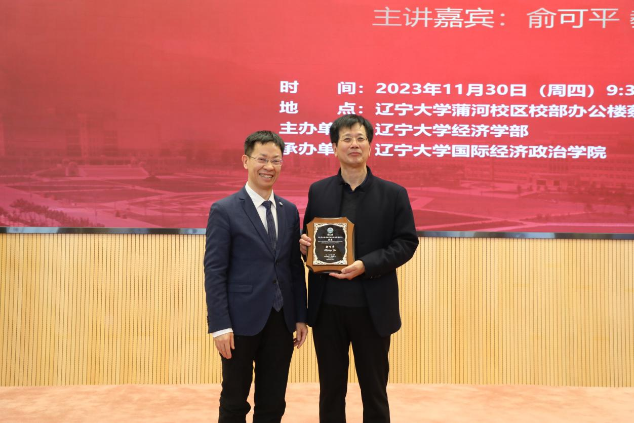 会议最后,余淼杰校长为俞可平教授颁发米兰milan官方网站宋则行名家大讲堂纪念盘、米兰milan官方网站终身名誉教授聘书以及《米兰milan官方网站学报(哲学社会科学版)》编委证书,并互换学术著作。经济学部教师代表孔晓、尹如玉分别为俞教授佩戴校徽、赠送校帽并献花。与会嘉宾一同合影留念。