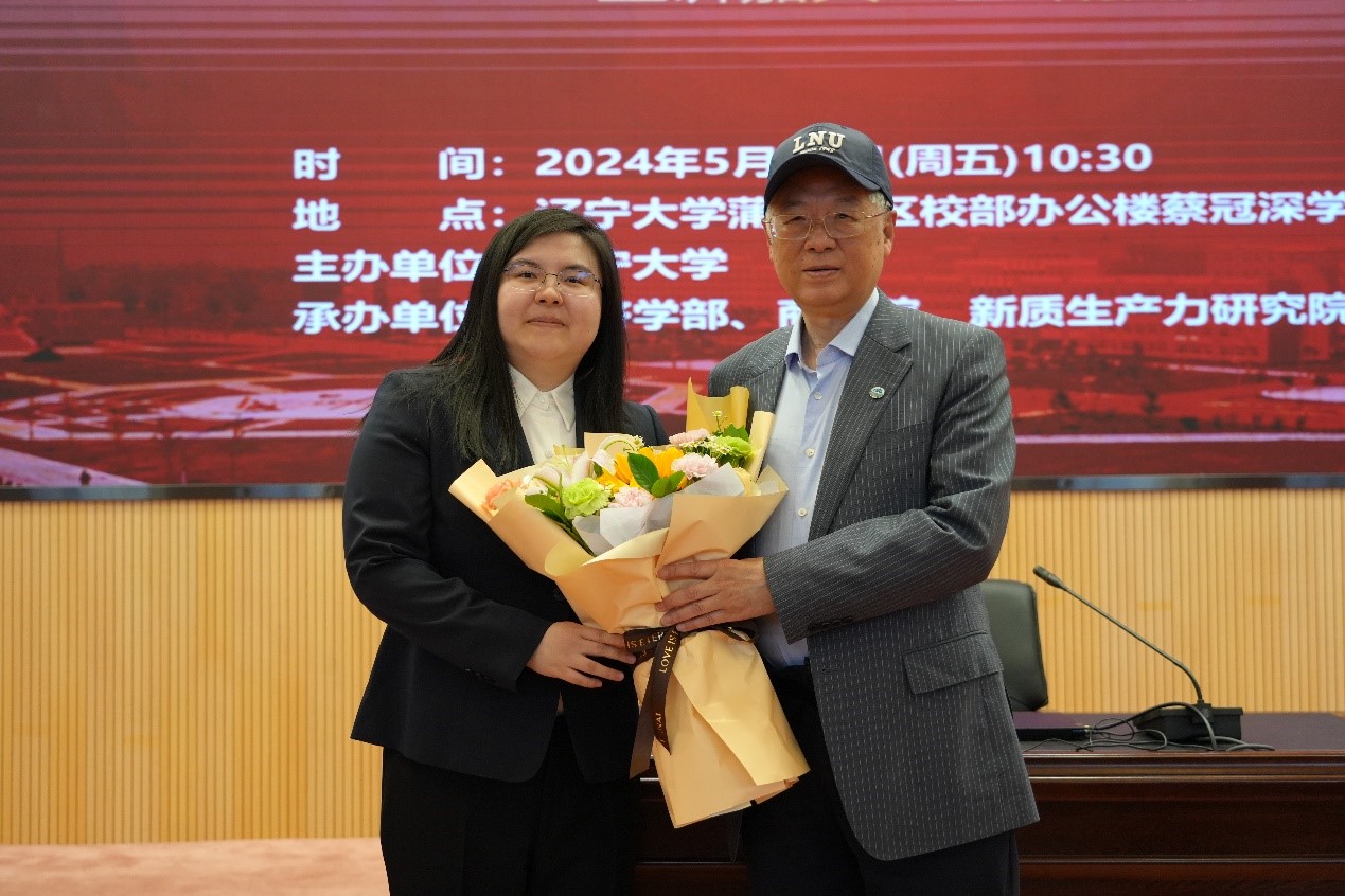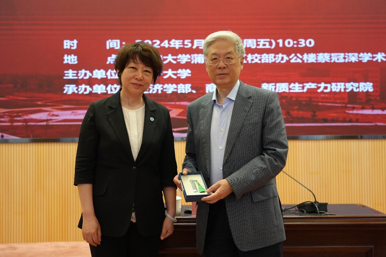 会议最后,余淼杰校长为金碚教授颁发米兰milan官方网站宋则行名家大讲堂纪念盘、米兰milan官方网站终身名誉教授聘书,商学院副书记兼副院长兼纪委书记马晓君教授为金碚教授赠送纪念品,商学院副院长韩亮亮教授为金碚教授赠送校帽,商学院副院长张广宁教授为金碚教授佩戴校徽,商学院徐堇老师为金碚教授献花,与会嘉宾一同合影留念。