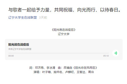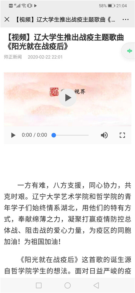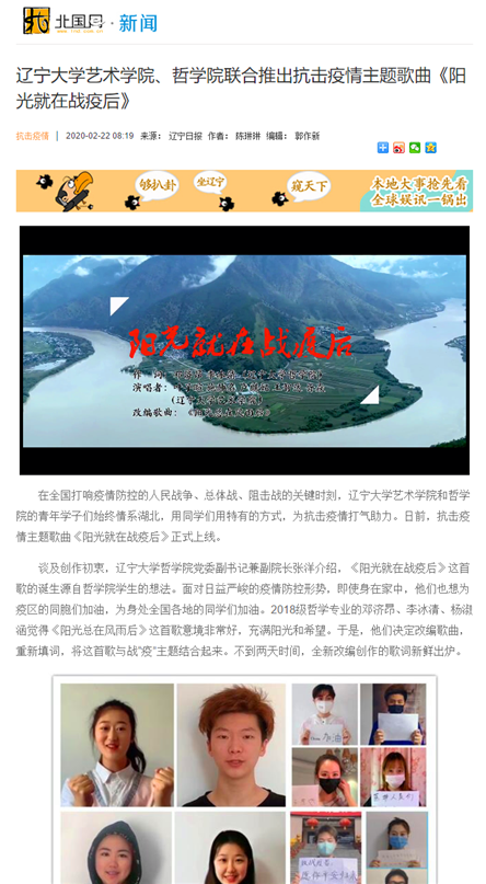 近日、我校艺术学院与哲学院师生联合拍摄了抗击新冠疫情的主题歌曲《阳光就在战疫后》,《辽宁日报》网络端“北国网”、辽宁广播电视台“教育青少频道”《沈阳日报》移动客户端及“米兰milan官方网站生在线联盟”对此视频进行了转载报道,现将报道截图转载如下: