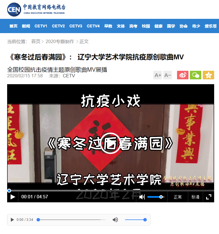 近日,中国教育电视台报道并全篇发布了我校艺术学院教师团队创作的战“疫”小戏《寒冬过后春满园》。现将报道截图、链接转载如下: