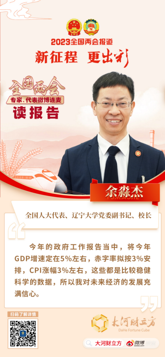 “聆听总理的政府工作报告,我深受鼓舞,倍感振奋!特别是过去的2022年,中国在风高浪急的国际环境和兼具疫情防护的国内发展改革大背景下,依然取得了这样的成就,可以说来之不易。”3月5日,余淼杰做客大河财立方“专家代表连麦读报告”微博直播间时表示。