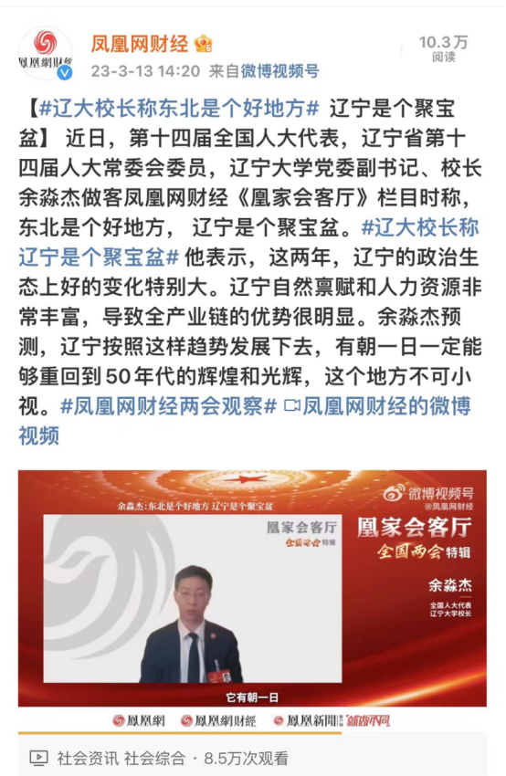 近日,第十四届全国人大代表,辽宁省第十四届人大常委会委员,米兰milan官方网站党委副书记、校长余淼杰做客凤凰网财经《凰家会客厅》栏目时称,东北是个好地方,辽宁是个聚宝盆。他表示,这两年,辽宁的政治生态上好的变化特别大。辽宁自然禀赋和人力资源非常丰富,导致全产业链的优势很明显。余淼杰预测,辽宁按照这样趋势发展下去,有朝一日一定能够重回到50年代的辉煌和光辉,这个地方不可小视。