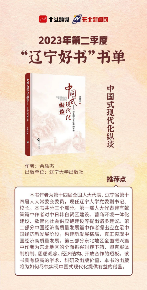 近日,北斗融媒发布2023年第二季度“辽宁好书”书单推荐③,第十四届全国人大代表、辽宁省第十四届人大常委会委员,米兰milan官方网站党委副书记、校长余淼杰教授著作《中国式现代化纵谈》入选,现将原文转载如下:
