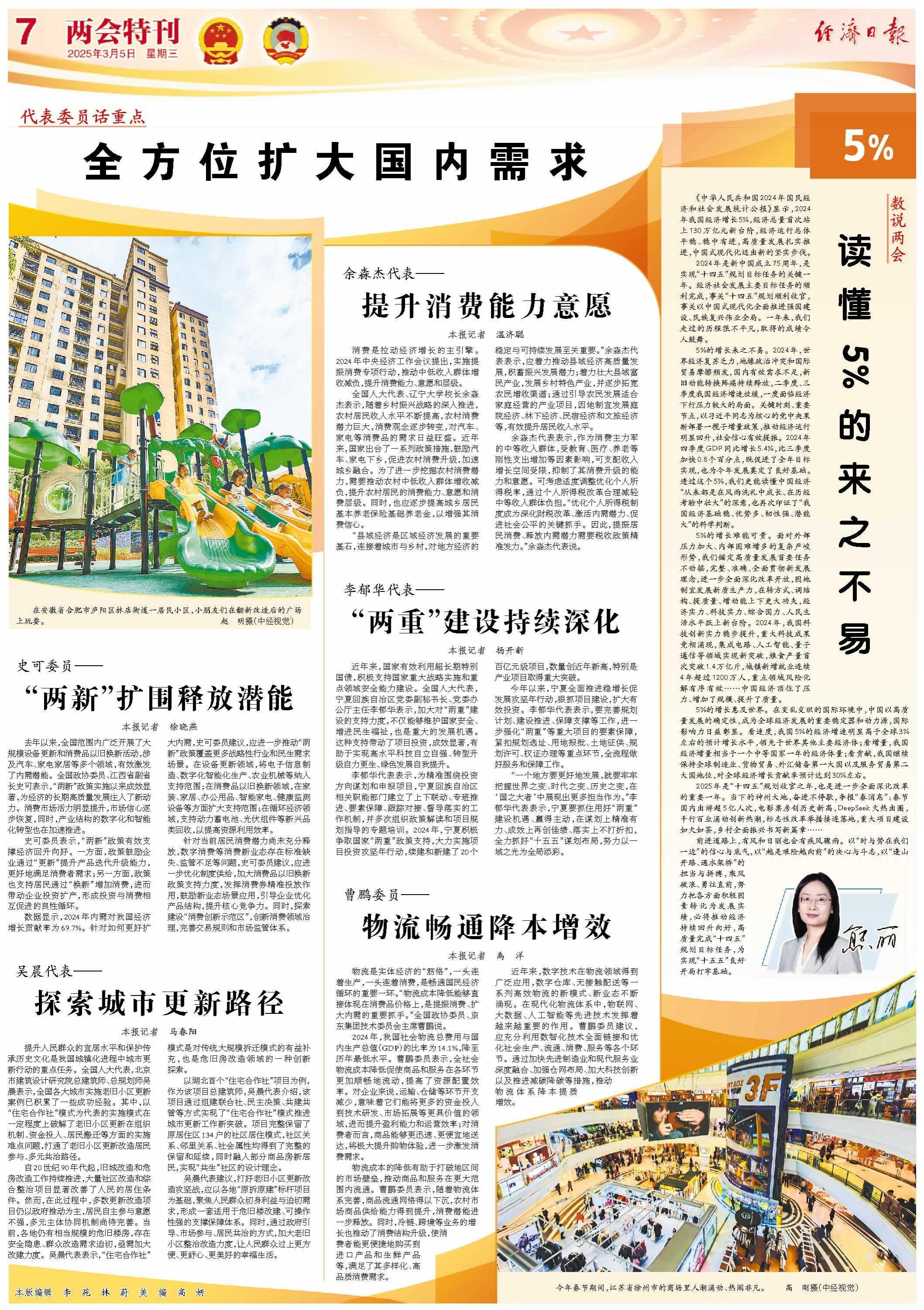 “县域经济是区域经济发展的重要基石,连接着城市与乡村,对地方经济的稳定与可持续发展至关重要。”余淼杰代表表示,应着力推动县域经济高质量发展,积蓄振兴发展潜力;着力壮大县域富民产业,发展乡村特色产业,并逐步拓宽农民增收渠道;通过引导农民发展适合家庭经营的产业项目,因地制宜发展庭院经济、林下经济、民宿经济和文旅经济等,有效提升居民收入水平。