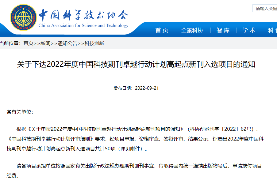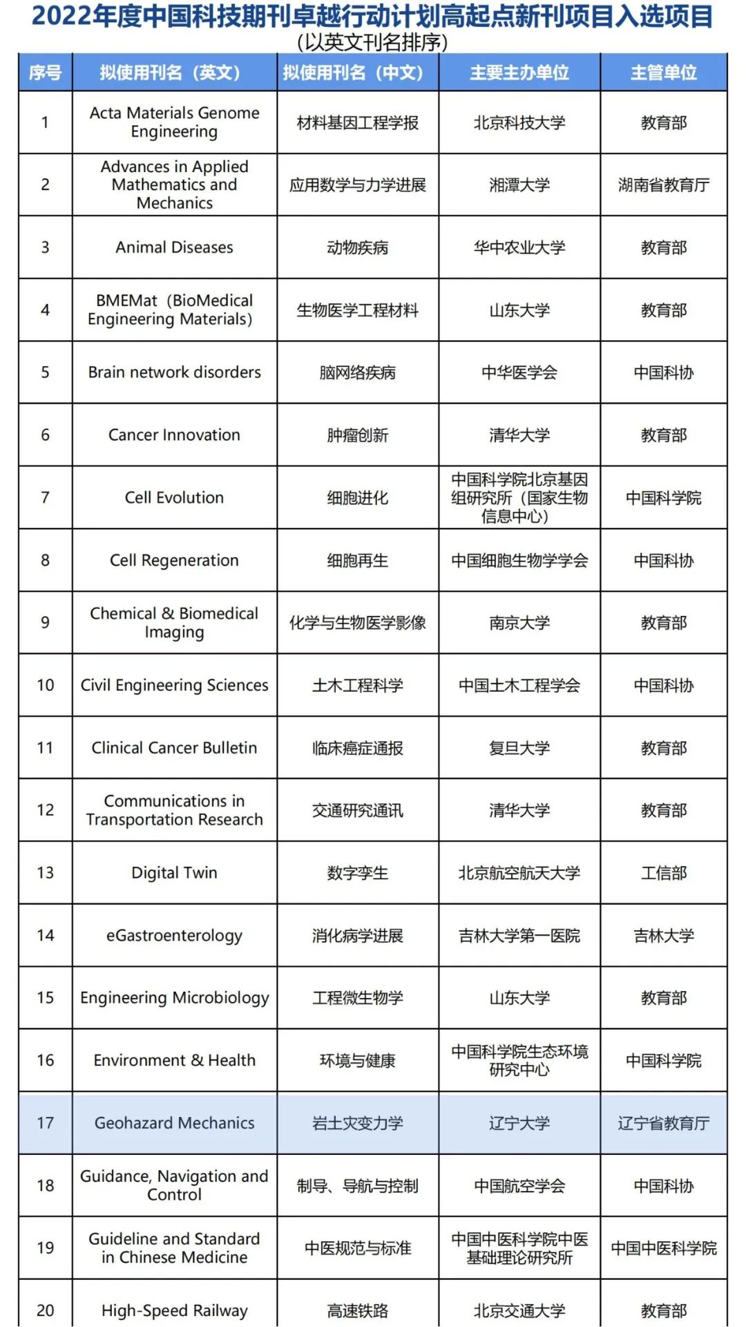 9月21日,中国科技期刊卓越行动计划办公室发布了《关于下达2022年度中国科技期刊卓越行动计划高起点新刊入选项目的通知》,米兰milan官方网站与中国岩石力学与工程学会组织申报的Geohazard Mechanics(ISSN:2949-7418)入选高起点新刊项目。入选后,期刊将获批国内统一连续出版物号,在中国落地,同时获批资助经费50万元。