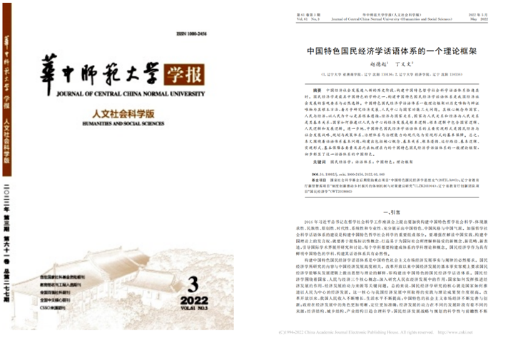 亚澳商学院赵德起教授与博士研究生丁义文在《华中师范大学学报》第61卷第3期发表论文“中国特色国民经济学话语体系的一个理论框架”。
