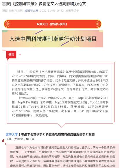 商学院副教授邢鹏作为第一作者和通讯作者,与硕士研究生尤浩宇、副教授樊玉臣合作在《控制与决策》2022年第1期发表封面文章“考虑平台营销努力的直播电商服务供应链质量努力策略”,并入选中国知网《学术精要数据库》2011-2022年“高被引、高下载、高PCSI”论文。