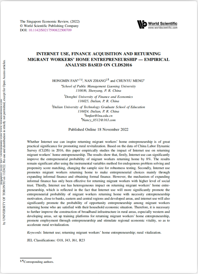 公共管理学院范洪敏副教授作为第一作者合作撰写的学术论文"Internet use, finance acquisition and returning migrant workers’home entrepreneurship — empirical analysis based on CLDS2016 "在国际期刊The Singapore Economic Review在线发表。