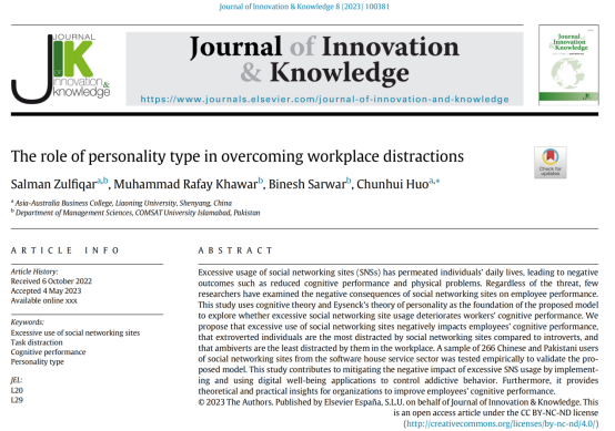 近日,亚澳商学院霍春辉教授的论文The role of personality type in overcoming workplace distractions被Journal of Innovation & Knowledge接受并在线发表。