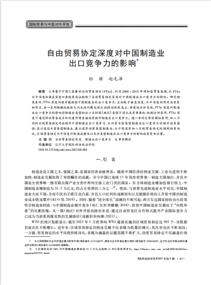 国际经济政治学院孙丽教授与硕士生赵毛泽合作论文“自由贸易协定深度对中国制造业出口竞争力的影响”在《世界经济研究》2023年第8期发表。