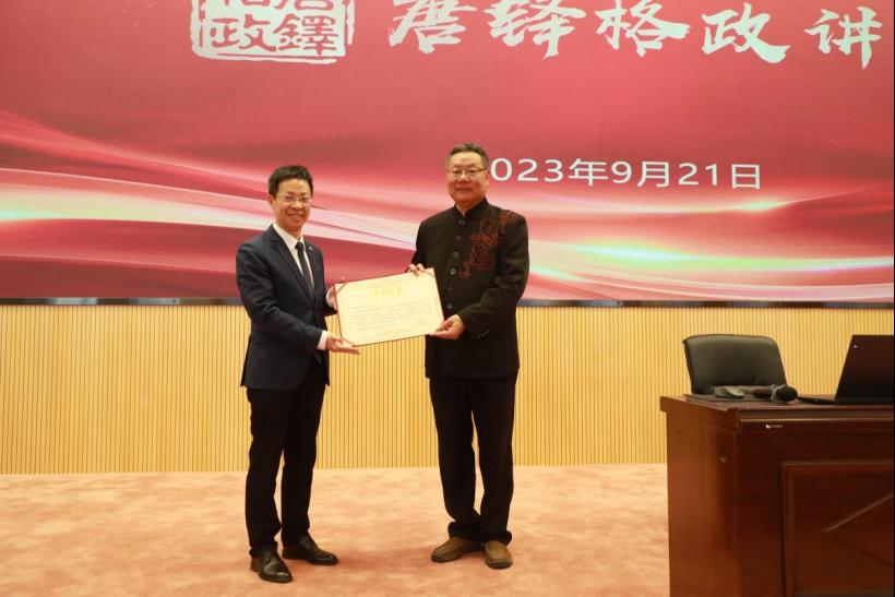 报告会结束后,余淼杰为颜廷淦颁发“唐铎格政讲座”纪念证书、纪念盘,米兰milan官方网站学生代表为颜廷淦献花致敬。