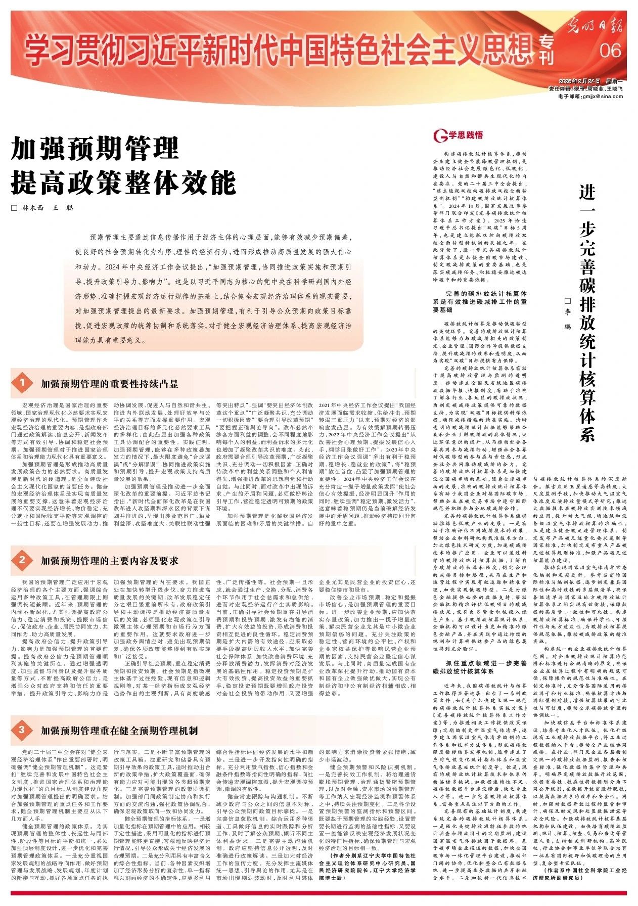 2025年2月24日,国民经济研究院院长林木西教授,与师资博士后王聪共同完成的论文《加强预期管理 提高政策整体效能》,在《光明日报》“学习贯彻习近平新时代中国特色社会主义思想专刊”发表。