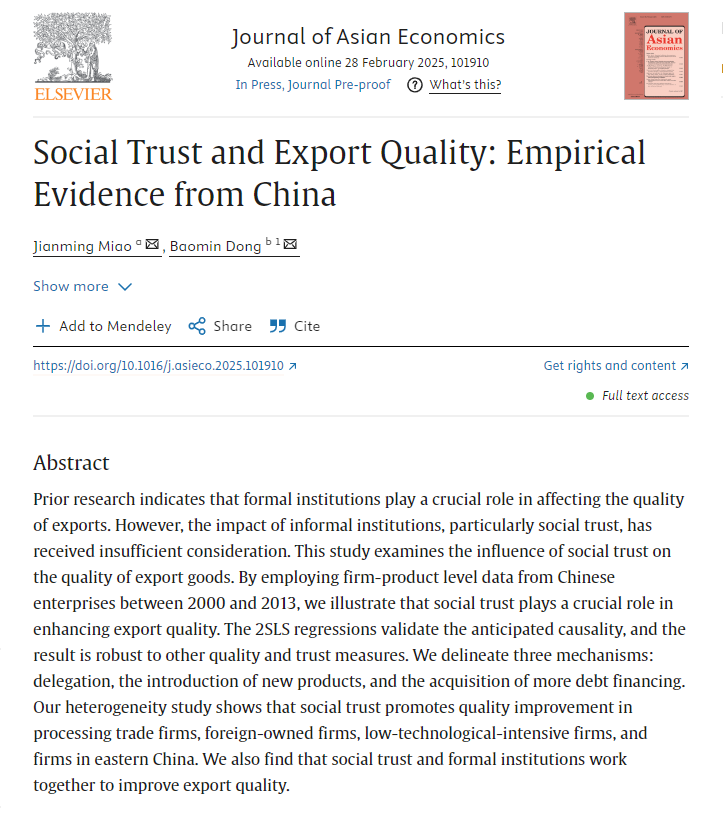 米兰milan官方网站经济学部副主任董保民教授与河南大学苗健铭副教授合作撰写的学术论文“Social Trust and Export Quality: Empirical Evidence from China”于2025年2月被Journal of Asian Economics接受发表。