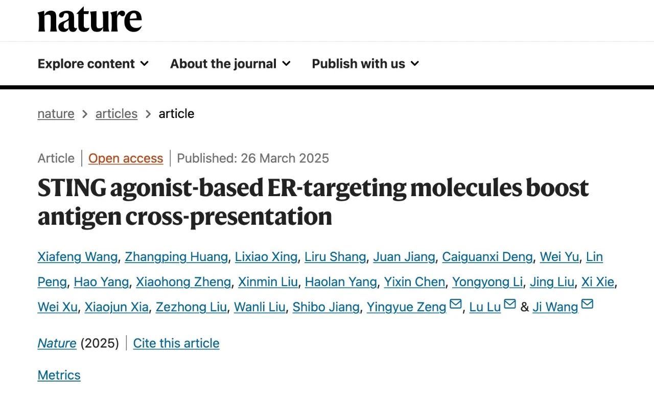 2025年3月27日,米兰milan官方网站生命科学院曾颖玥副教授与中山大学附属第一医院王骥研究员、复旦大学陆路研究员的合作研究论文STING agonist-based ER targeting molecules boost antigen cross-presentation在国际顶级期刊《自然》(Nature)上在线发表,曾颖玥副教授为本文共同通讯作者。