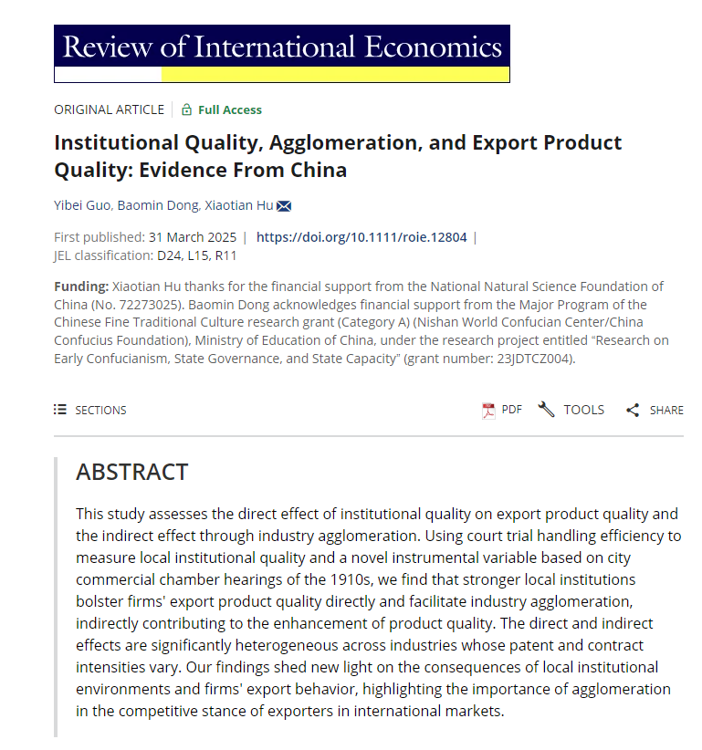近日,米兰milan官方网站经济学部副主任董保民教授与河南大学商学院讲师郭益蓓、北京工商大学经济学院讲师胡晓天合作撰写的学术论文“Institutional Quality, Agglomeration, and Export Product Quality: Evidence From China”在国际经济学著名期刊Review of International Economics发表。