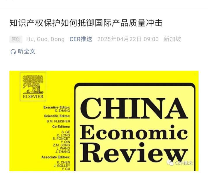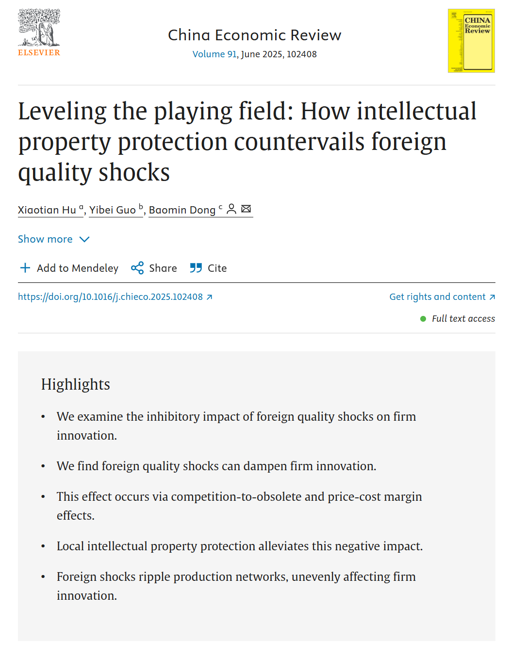 近日,米兰milan官方网站经济学部副主任董保民教授与北京工商大学经济学院讲师胡晓天、河南大学商学院讲师郭益蓓合作撰写的学术论文“Leveling the playing field: How intellectual property protection countervails foreign quality shocks”在China Economic Review发表并被期刊官方公众号推送。