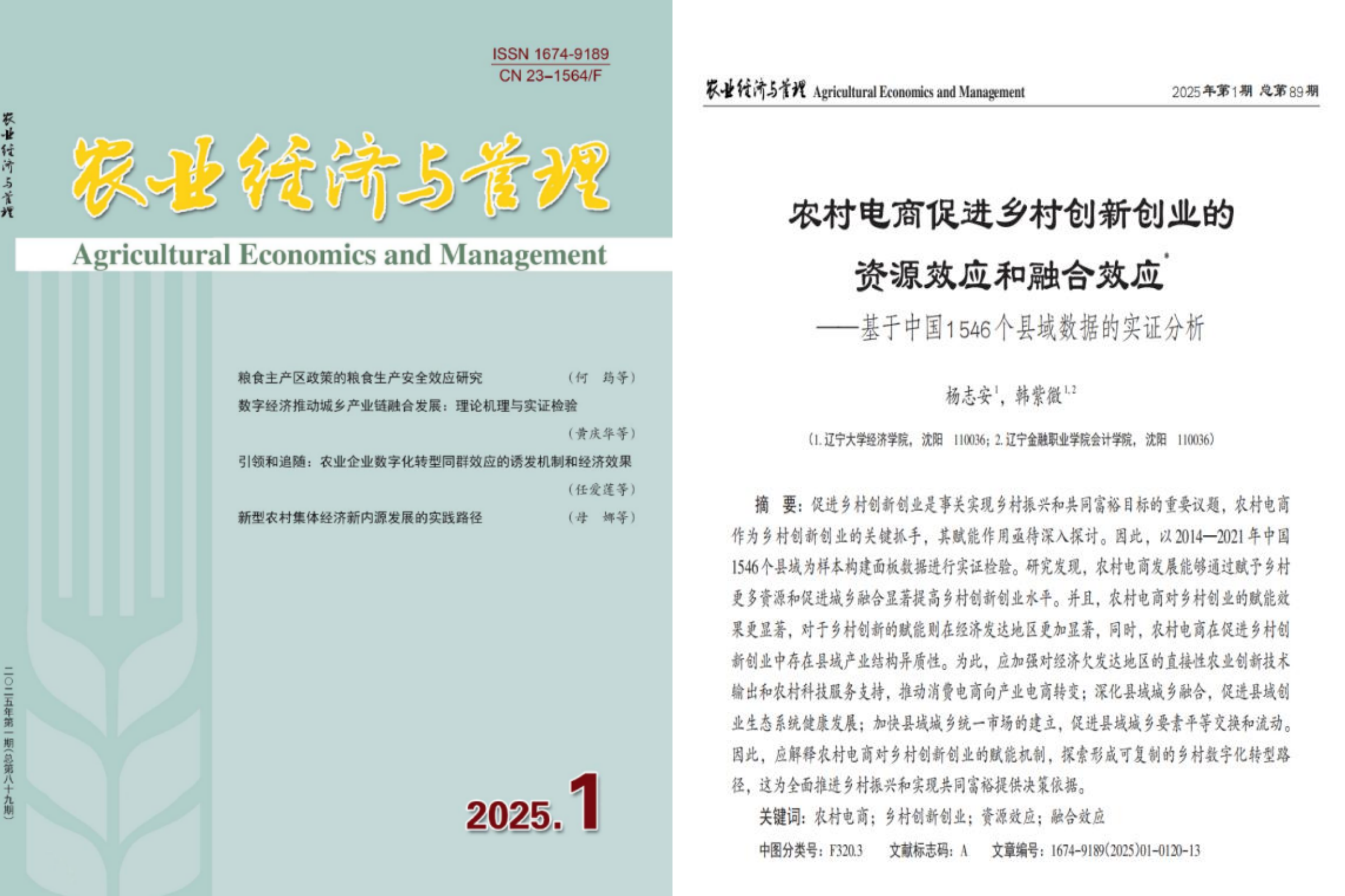 经济学院杨志安教授与其指导的博士生韩紫薇在《农业经济与管理》2025年第1期发表论文《农村电商促进乡村创新创业的资源效应和融合效应——基于中国1546个县城数据的实证分析》。