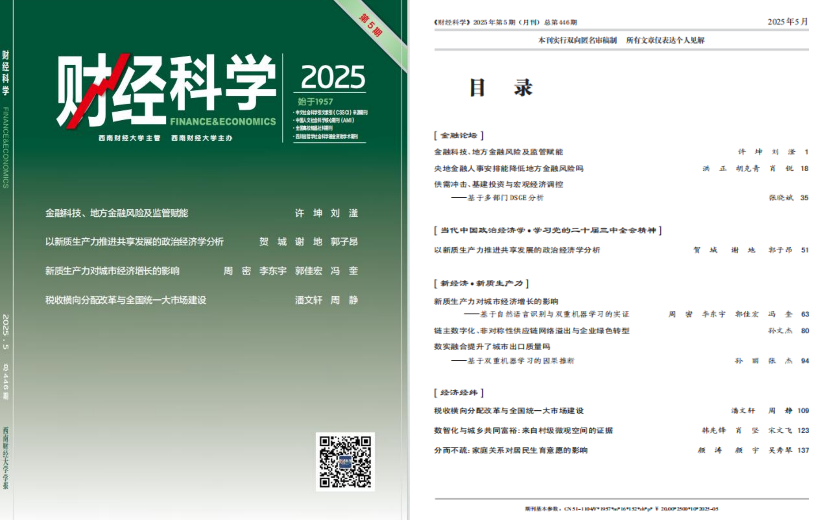 近日,经济学院贺城讲师与谢地教授、硕士研究生郭子昂合作在《财经科学》2025年第5期发表封面文章,题为《以新质生产力推进共享发展的政治经济学分析》。