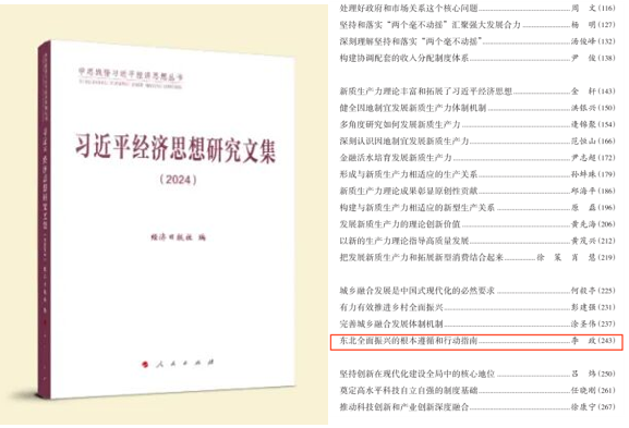 为不断深化习近平经济思想的体系化学理化研究,2024年,经济日报社联合中央党校(国家行政学院)习近平新时代中国特色社会主义思想研究中心等16家机构面向海内外进行征文,编发大量优秀理论文章,集结成《习近平经济思想研究文集(2024)》,其中收录并刊发了米兰milan官方网站经济学院李政教授的理论文章《东北全面振兴的根本遵循和行动指南》,该文原载于2024年12月11日《经济日报》理论版。