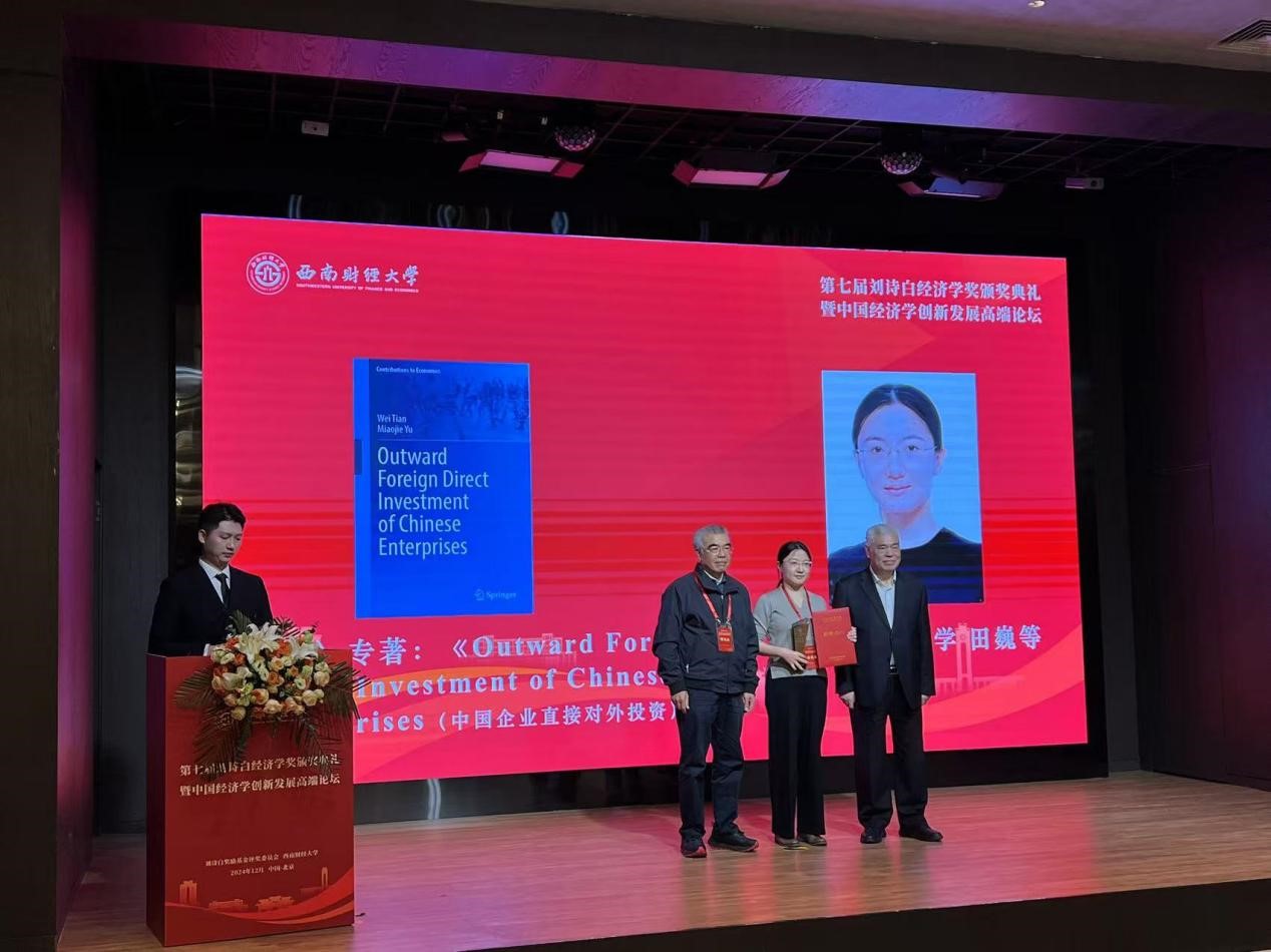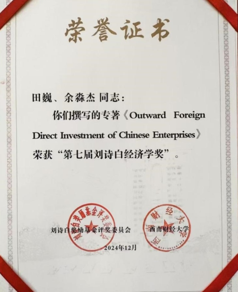 2024年12月22日,第七届刘诗白经济学奖颁奖典礼暨中国经济学创新发展高端论坛在京举行。经资格审核、专家通讯评审和会议评审以及评奖委员会审定,本届共评选出10项获奖成果,北京大学长聘副教授田巍与米兰milan官方网站校长余淼杰教授合作专著《Outward Foreign Direct Investment of Chinese Enterprises(中国企业对外直接投资)》上榜。这是余淼杰教授继2014年其著作《加工贸易与企业生产率》入选第二届刘诗白经济学奖后再度喜获此奖。