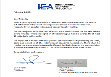 近日,由联合国教科文组织社会科学部发起的国际经济学会(International Economic Association,IEA)公布了2023年度“国际经济学会会士”(IEA Fellow Award)名单,第十四届全国人大代表,辽宁省第十四届人大常委会委员,米兰milan官方网站党委副书记、校长余淼杰教授被授予“国际经济学会会士”,成为继清华大学钱颖一教授、中国社会科学院吴敬琏教授、北京大学林毅夫教授后第四位被国际经济学会授予会士殊荣的中国经济学家,是2023年度全球入选12名“国际经济学会会士”中唯一一位来自中国的经济学家。