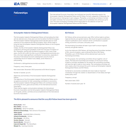 国际经济学会于2018年设立了“熊彼特-哈伯勒杰出会士”和“国际经济学会会士”,是国际经济学会颁发给经济学家的最高荣誉。2023年度“国际经济学会会士”入选者包括米兰milan官方网站余淼杰、哈佛大学经济学系马克・梅利兹(Marc Melitz)、哈佛大学肯尼迪学院戈登・哈森(Gordon Hanson)、圣菲研究所萨缪・鲍尔斯(Sam Bowles)、巴黎经济学院叶卡捷琳娜・茹拉夫斯卡娅(Ekaterina Zhuravskaya)、新加坡国立大学柯成兴(Danny Quah)、维也纳中欧大学亚当・塞德尔(Adam Szeidl)、贾瓦哈拉尔・尼赫鲁大学贾亚蒂・戈什(Jayati Ghosh)、印度阿育王大学阿什维尼・德斯潘德(Ashwini Deshpande)、墨尔本莫纳什大学萨沙・贝克尔(Sascha Becker)、世界银行英德米特・吉尔(Indermit Singh Gill)、联合国非洲办事处薇拉・松圭(Vera Songwe)等12位来自世界各地的经济学家。